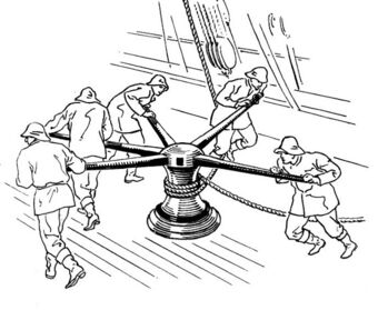 Capstan – a broad revolving cylinder with a vertical axis used for winding a rope or cable, powered by a motor or pushed round by levers.